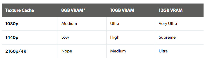 游戏中显卡的显存分配尤为重要,因为游戏似乎是围绕12GB显存基准构建的,因此,拥有8GB或10GB显存的显卡可能会遇到纹理缓存设置的问题。例如,在1440p分辨率下,RTX 3080(10GB显存)无法使用超高纹理缓存选项以避免出现性能大幅下降,而8GB显存的用户可能会遇到更严重的问题。