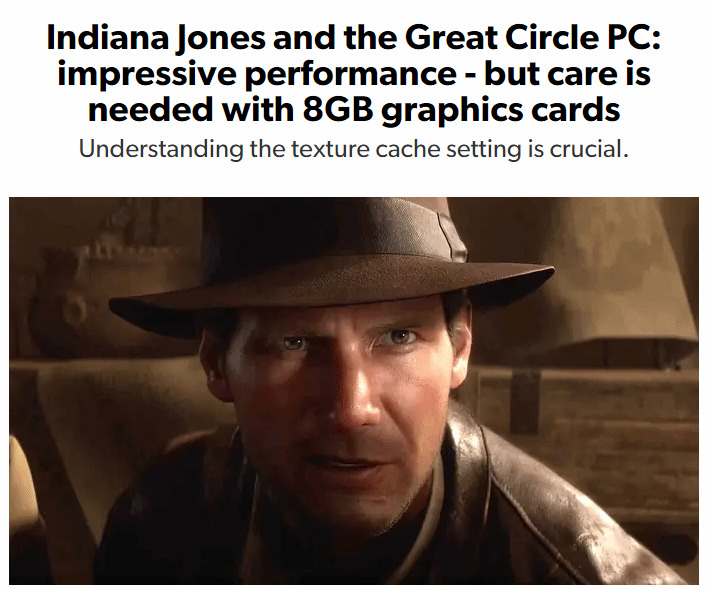 知名测评媒体digitalfoundry(数毛社)发布了新作《夺宝奇兵:古老之圈》的PC版本技术报告。媒体指出,游戏的PC版性能表现令人印象深刻,但会受到GPU显存分配的限制,对于使用8GB显卡的玩家来说,可能需要对纹理缓存选项进行一些设置来获得更好的体验。