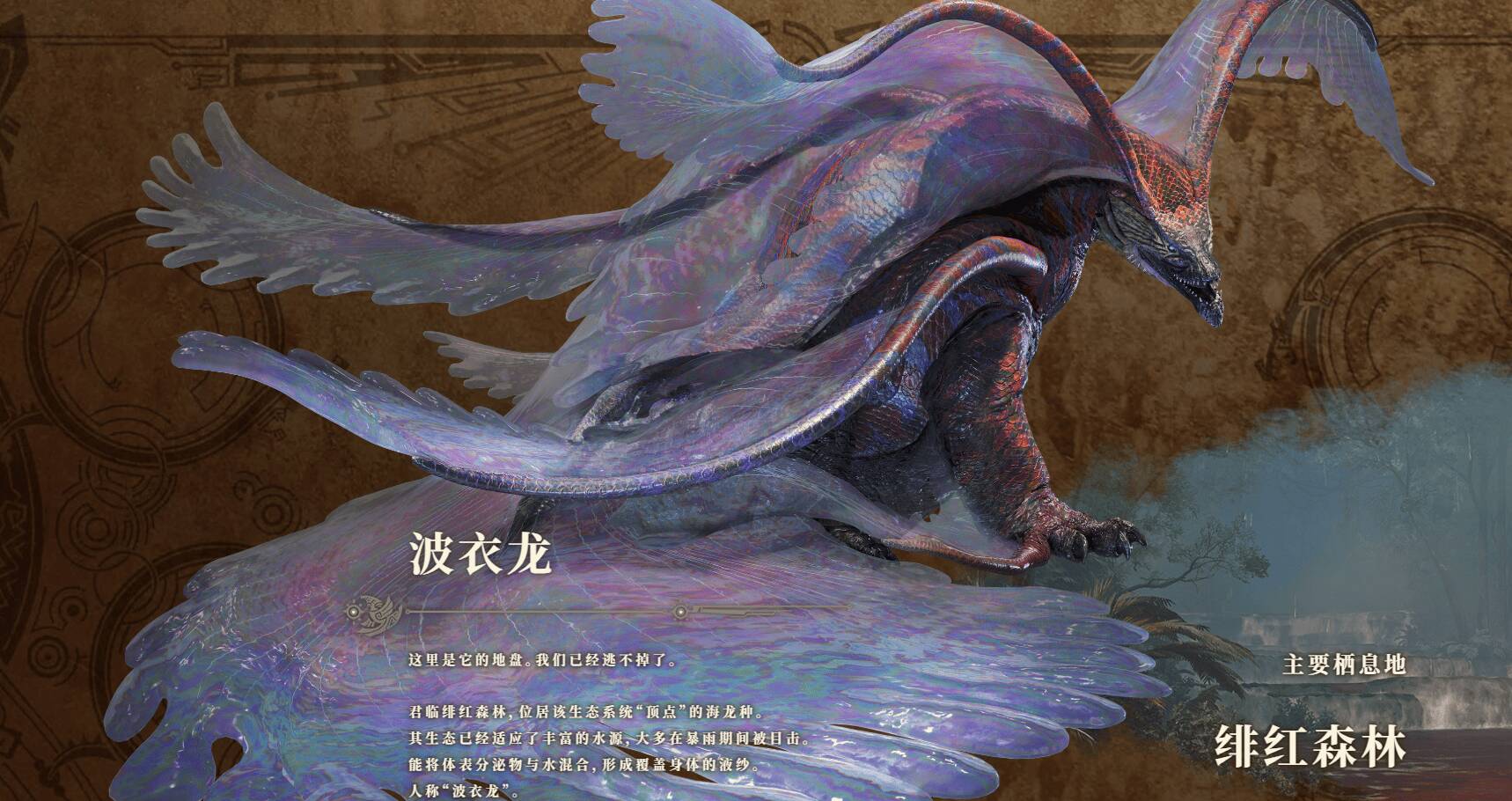 波衣龙是地图绯红森林的地图王,地位类似于天堑沙原中的煌雷龙,后者我们已经在beta中见识过了,而这次的重头戏就是前者波衣龙。而顺带的或许还会有更多关于绯红森林的消息。距离发售还有两个半月了,卡普空别挤牙膏了!