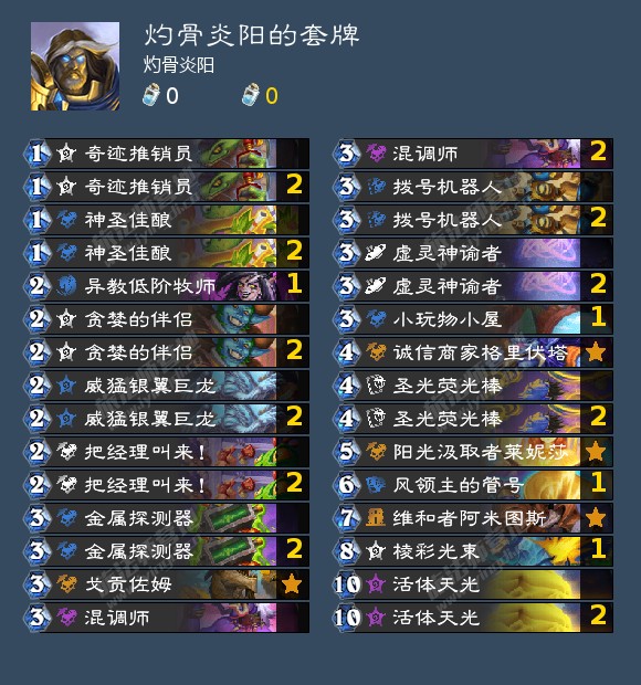 打下来只感觉德鲁伊难打,准时369基本没什么办法,带130其他对局没用,打德鲁伊不一定抽得到,抽到也不一定打得赢,还会卡拨号检索莱妮莎