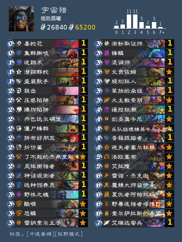 实测在低分传说表现还可以,在与主流卡组的对局中,打30任务术小劣,但是打40任务术是小优,抗快抗很强,打暗牧和圣契骑是大优,和大哥萨差不多均势,所以理论上那这套卡组上传说应该是可行的,但是我这个月是用元气骑上的。宇宙猎是狂野中为数不多的中速卡组,带来的游戏体验是独一无二的,真的很建议有尘的人合一套玩,不会后悔的,我已经尽量在保持强度的基础上减少造价了
