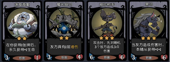 黑猫:在掷斧者和女妖出来之后,在3本战力中地位略有下降,但是高贵的野兽属性 允许其有增伤。
