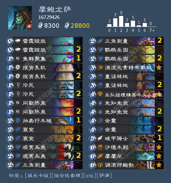 (摩摩尔+鲍勃可以打出AV娜王库恩的效果,配合破甲骑士和新老红龙的战吼可以瞬杀大部分职业),关键检索牌(观鸟,先知先觉,地标),关键牌(摩摩尔大木刻鲍勃),偷费手段(武器(不稳定),猎人地标(最优,但是需要提前打),雷霆绽放),启动方式:启动回合六费(后手最快五费)①前置大木刻,第二回合摩+鲍(通常回两口水晶)+小木刻+牛(组一辈子乐队)+老红龙+元素+新红龙②摩+雷霆绽放(或提前打下的猎人地标)+鲍,剩下的同①小tips:强行启动缺key牌可以用鲍勃技能检索上来