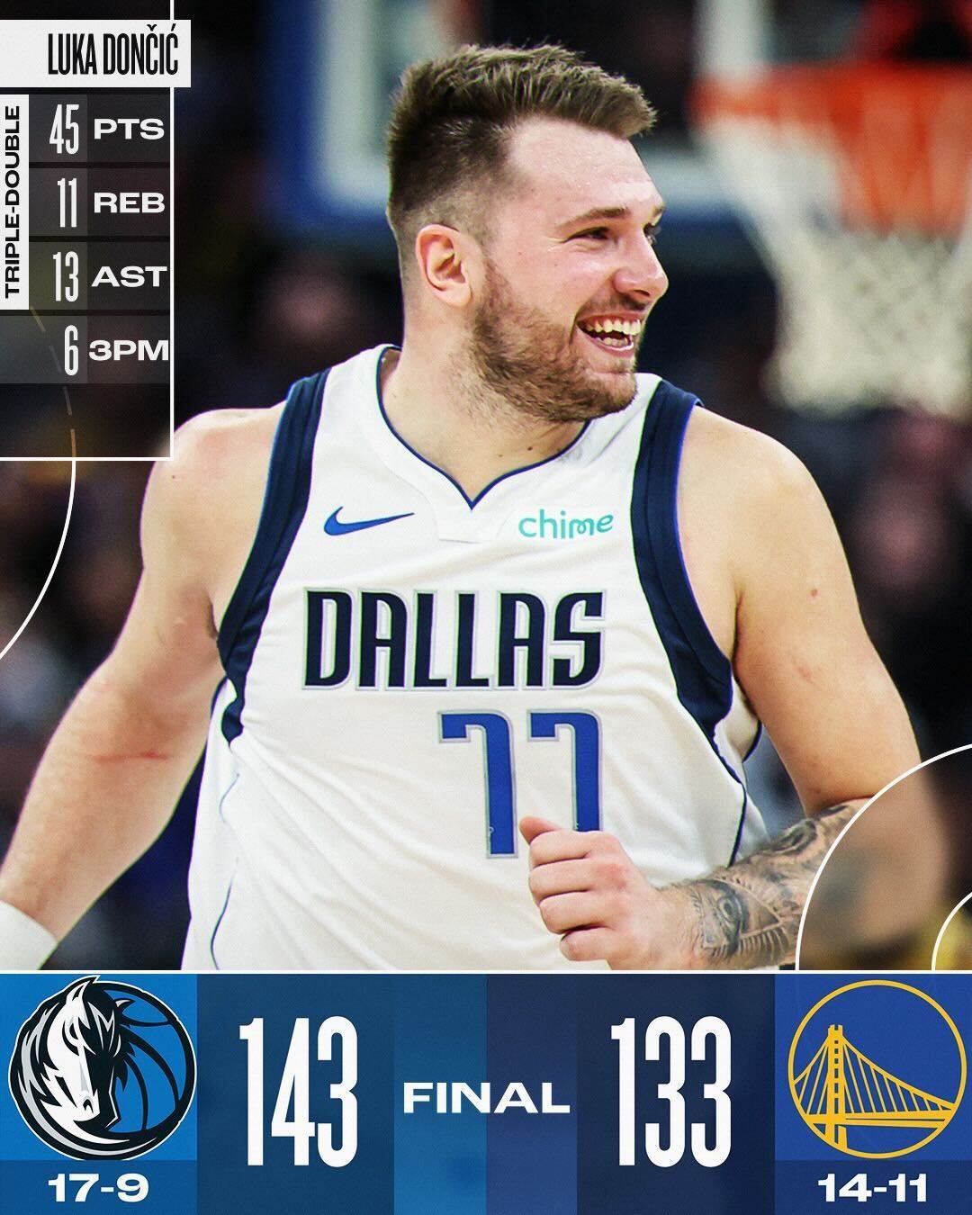 独行侠队卢卡·东契奇表现出色,狂砍45分、11板和13助大三双;克莱汤普森得到29分面对旧主杀红眼。勇士队斯蒂芬·库里26分10助5板但末节连续关键三分不中葬送比赛。勇士队在输掉这场比赛后,从西部第五跌至西部第八,没能延续赛季初的良好状态,此前,他们一度排在榜首。