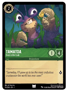 出自2016年电影《海洋奇缘》,塔玛托阿似乎在中文版里就被翻译成了“螃蟹怪”,卡牌描绘了它小时候的样子,从小就喜欢亮闪闪的宝贝是吧。