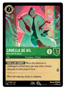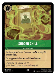 出自1961年电影《101忠狗》,Sudden Chill是男主人受到妻子朋友库伊拉启发创作的歌曲,插画描绘的是库伊拉初次登场拜访男女主人家,向他们索要斑点狗的场景,因为库伊拉打算强买强卖,所以效果是让对手弃一张牌。
