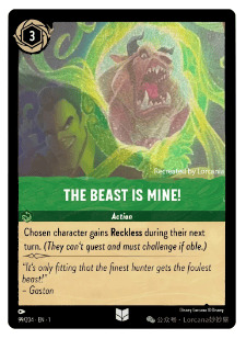 出自1991年电影《美女与野兽》,野兽赠予贝尔一面魔法镜子,让她可以看到城堡中的自己,但是加斯顿抢夺镜子后,他用这件宝物向村民们展示发狂的野兽,教唆大家一起去攻打城堡,同时放话:野兽的人头是我的!这张牌是让角色获得鲁莽,也比较符合电影剧情。
