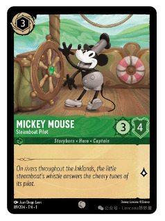 出自1928年的《汽船威利号》,米奇形象初次登场的作品,所以米奇到今年也有96岁的高龄了。米奇边吹口哨边驾驶汽船的动画经常出现在各种迪士尼作品的片头,需要注意的是虽然插图和原作似乎一模一样,但实际上是完全重绘的。