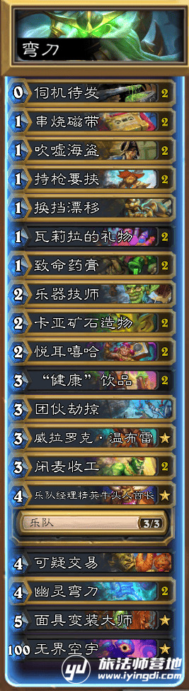 最开始抄的里面带了双暗影步和尤朵拉。私以为暗影步基本只有和威处有配合,没有威处经常卡在手里;尤朵拉则是感觉不管打快攻和慢速都很亏节奏,本身我们上弯刀基本等于空过一轮。打了几把之后直接换成了双吹嘘海盗和团伙劫掠。在玩的时候也有在想怎么精进这套卡,不过最终是上图这套就没动过了。团伙劫掠可能争议比较大,但是它的好处是起手可以伺机待发团伙劫掠直接过三张。乐器技师带两张其实也可以,这个看大家个人喜好吧。接下来会说对每张卡牌的理解。
