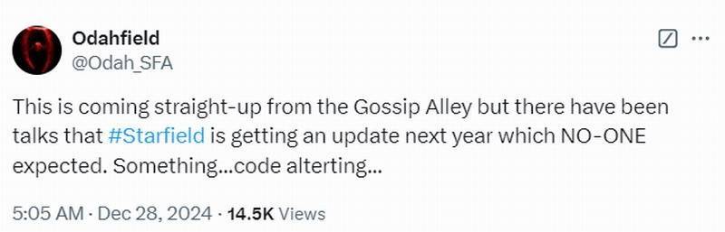 Odah_SFA表示:“有消息称《星空》将在明年进行重大更新,这是所有人没预料到的。还有些......游戏代码将修改。”