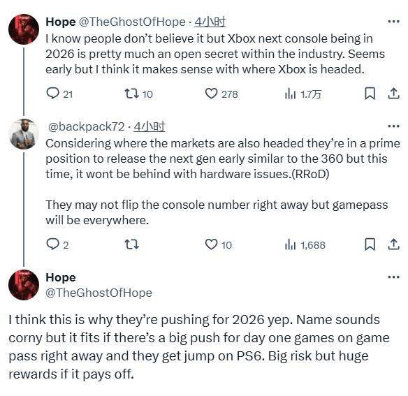 考虑到Xbox Series X|S在2020年推出,Xbox选择在2026年就更新换代确实有点早,但Ghost of Hope也分析称Xbox的发展方向是合理的,“Xbox Prime”这个名字听上去很土气,但是如果能大力推广XGP,并强占PS6的市场,那么就很合适。这种做法风险很大,但如果成功,回报也很大。