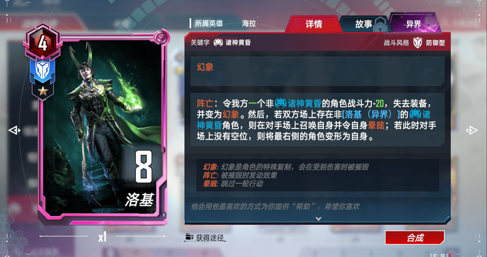 异界洛基是设计最完美的卡之一,这张卡让小身板的卡组有了可以和大身材卡组一决雌雄的机会,任对方身材再大,被洛基变幻象后,也是一碰就碎,后期配合诡计幻象使用:
