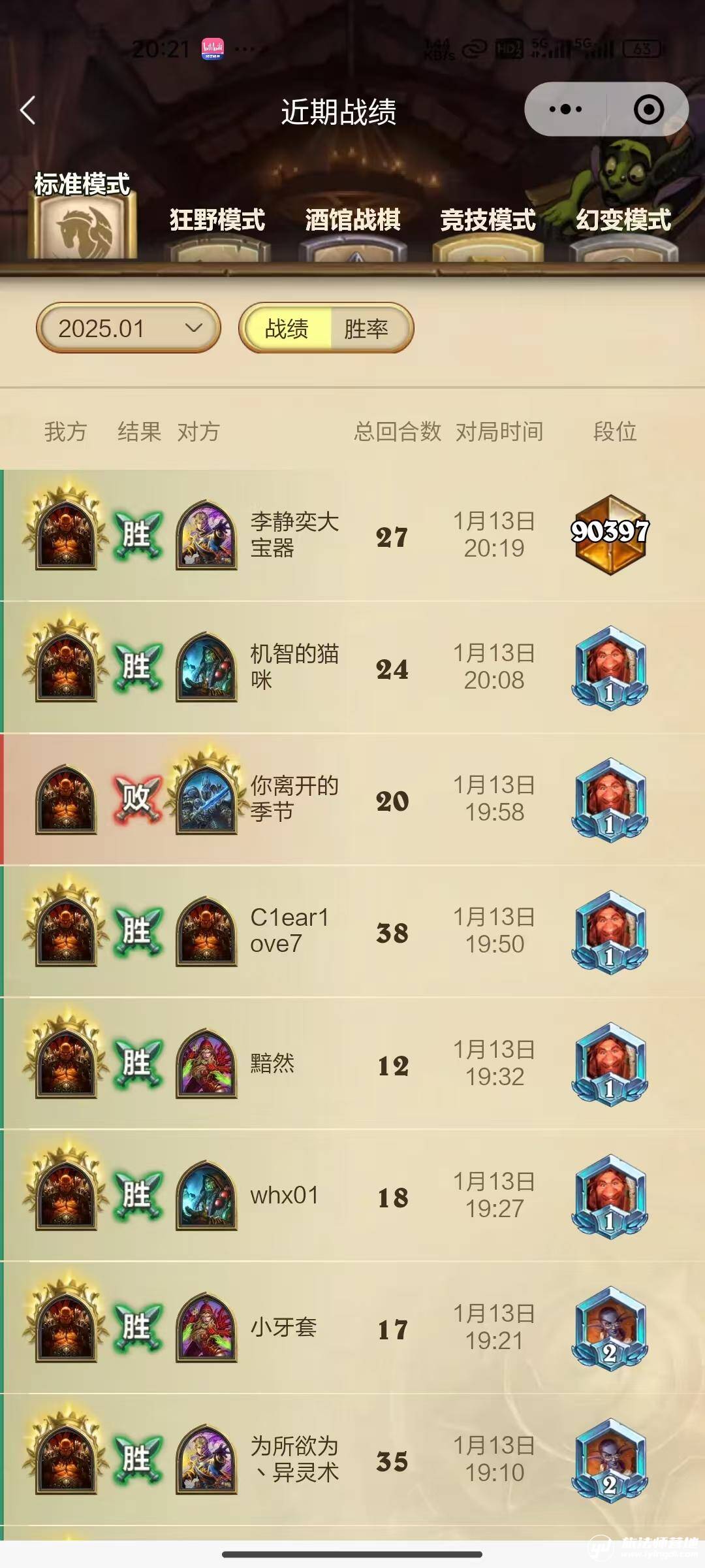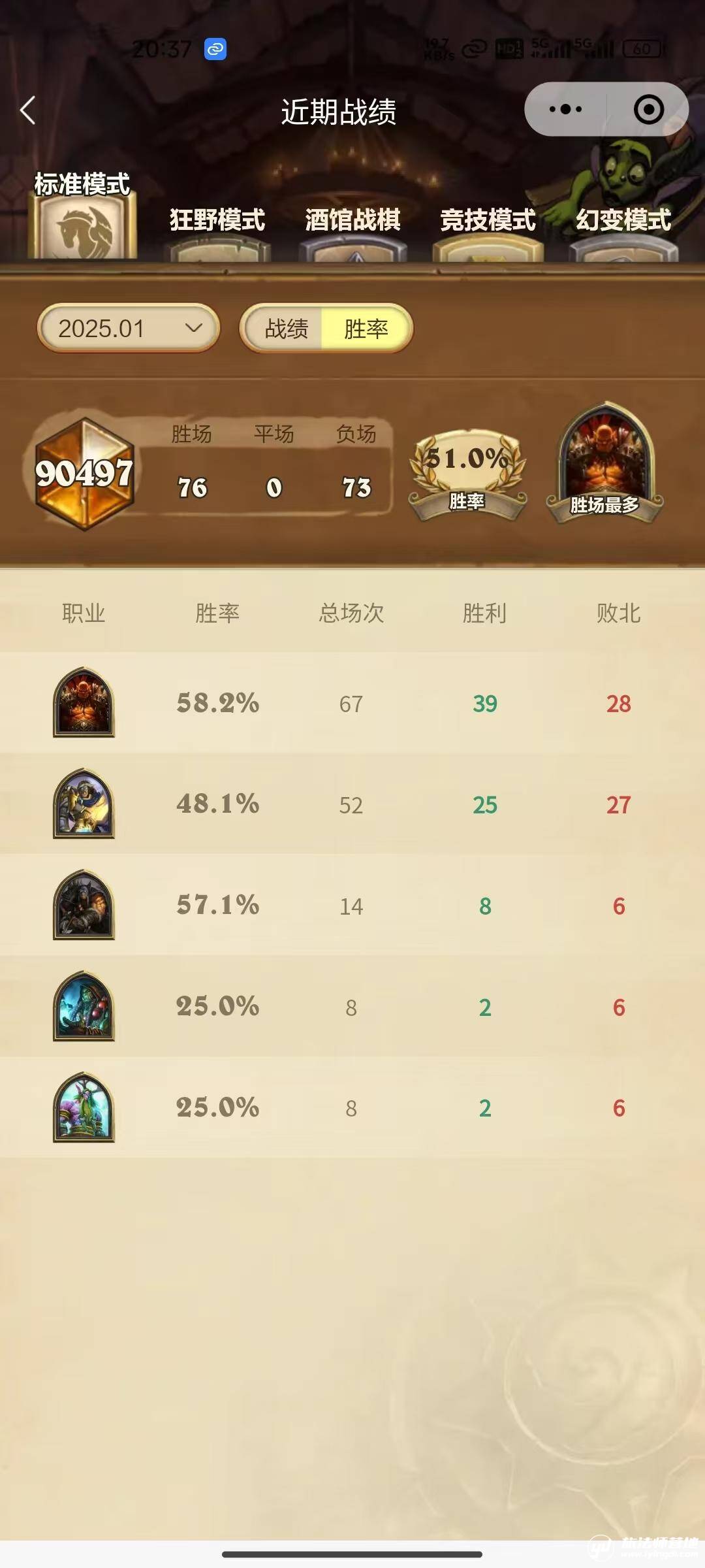 先上战绩胜率:炉石小程序显示打了67把58%胜率,最近20把是16-4。前面也有在调整卡组,所以后期胜场会比前期更好看一点。