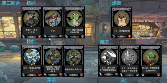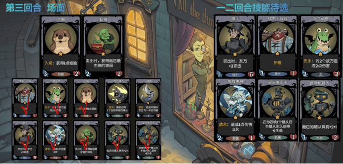 接着第二回合我们接着看商店中,最差又会出现567三张与之前不同的随从(5 6 是上回合商店没选的牌),然后技能最差出现8 9 0三张随从可以继续不选;此时再从商店拿一张7。此时我们一共有123 890可选2 以及到手的4、7。
