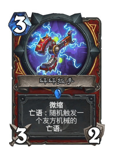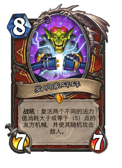 我们搜索战士的机械相关卡可以发现,其中有零件破拆、炮灰出动等多张当前进不了构筑的配合卡,其中很大一部分原因就是战士当前没有足够的适合配合的机械。而在战士的星舰变为机械后,其中可供开发的配合多了许多。在这些可以配合的单卡中,最令人期待的就是砰砰扳手和发明家砰砰。