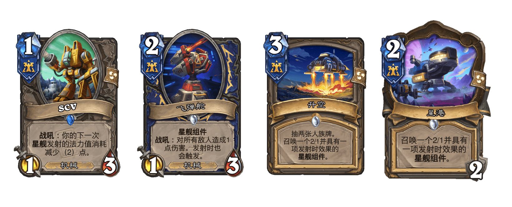 纵观人族的迷你包新卡的话,可以看出它们主要是走的多次发射星舰的节奏卡组思路,依靠共用卡可以快速出21战机来抬高发射星舰的价值,又有各自的手段降低发射星舰的费用,同时改为发射时触发的效果也避免了像老一批星舰一样被拐走的命运,而可以被检索的英雄牌也提高了这一思路的稳定性,使得这一思路直观上可行。而在此之外,一些单卡间的配合也带来了值得开发的新思路。