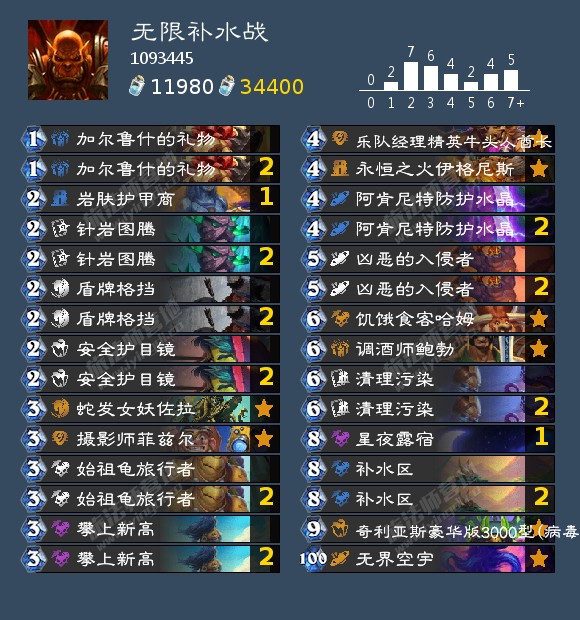 在小版本更新前终于上了传😭期间玩了十几种构筑,虽然知道污手萨很强,但是玩起来确实少了点意思。玩了好几天战士,葫芦的奥丁防战、营地里的无限宇宙战,包括一些补水战,但是总被狠狠暴打。在钻五到钻一翻滚了将近一周,昨晚在B站评论区抄了套无限补水战(疑似来自驴哥的构筑),今天从钻四零星上传,胜率估计在80%左右。起手方面攀爹必留,判断对面形态,快攻留爆甲和其他解牌,慢速找盾挡和铸甲师等过牌。无限组件:拍照+蛇女+保留组件,保留组件必备:无界空宇+补水区,特殊情况可以加入攀爹或爆破工头。补水区正常情况:奇利亚斯+食客+星舰组件,面对快攻在送掉两个434的组件以后,可以直接发射星舰,这样补水区:奇利亚斯+食客+星舰868(叠12甲)。如果对方是慢速如dk和德,并且开🥚,考虑尽量让星舰变大一些再发射,提高后期无限补水质量。奇利亚斯大概率会被对面鲍勃破坏,但大部分情况下无限不会掉血,解场有无界负责,所以被买就买了,不用专门省鲍勃。牛对应三种情况:🥚非必要不用,只有在无限组件被破坏或牌库里有大量炸弹、疫病的时候。🥚并不强,优先选择无限。剩下两个:对手偏向大量组件的otk或者同样可能无限并且组件还在牌库选工头,但要防对面复制或者鲍勃。一般情况选奥丁,无限的时候可以补水区+无界空宇为自己提供大量攻击并且清理嘲讽给对面脸上来一下。对战污手萨等快攻大优,解牌带的非常足,外加乌龟和星舰的保护。经常会有乌龟亡语给7费奇利亚斯,7费准时拍吓走污手萨。对战虚灵贼要及时找锻造好的6费爆甲,处理好一波巨人以后安心叠甲,龟就行了。对战大哥德大哥牧,遇到的相对较少,但基本上也是留好爆甲,提前叠好甲应对杜加尔,拖入后期战就可以。大劣小行星萨,只能看前期叠甲够不够,能不能在对面小行星变得有威胁前补充好护甲。小劣疫病dk,有点看对方海拉以及塞疫病的速度,必要就开🥚听天由命。均势彩dk,只有海拉,后期拉入无限战的准备,耗着就可以。法术法大致思路也是龟,元素法留好解牌。内战凭运气,不太擅长。
