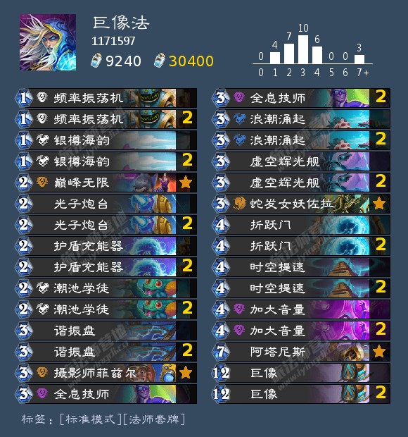 构筑还不完善,但是我感觉这套思路还行,全息技师加饮品配合浪潮能够很好的防守虫族的进攻,和中慢速打就尽可能快速过牌用法术叠巨像输出,叠个十几层,拍个照然后一回合一个巨像推翻对面,我们巨像是手牌中法力消耗最高的牌一般吃不到幽灵,除了拍照佐拉照片剩下的牌随便他幽灵吃