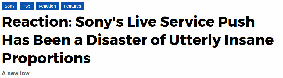 外媒pushsquare对此锐评称“索尼大力进军实时服务领域是一场极其疯狂的灾难”。在前任CEO吉姆·瑞安的领导下,索尼曾宣布进军该市场,意图打造PS5时代的超级热门游戏,追求前所未有的收入规模。虽然许多公司都希望分这一杯羹,但索尼仍选择了“全力押注”。
