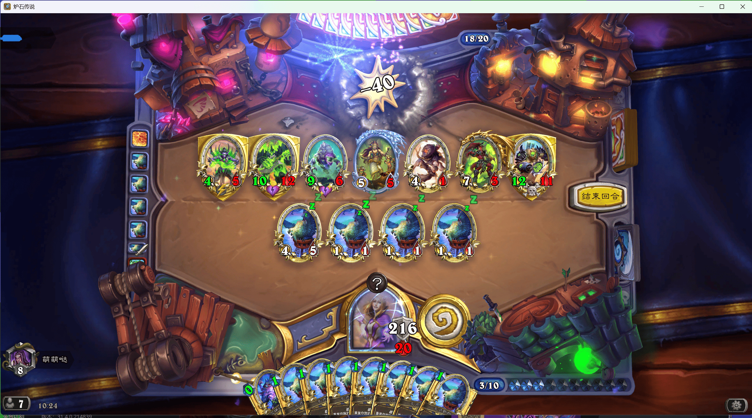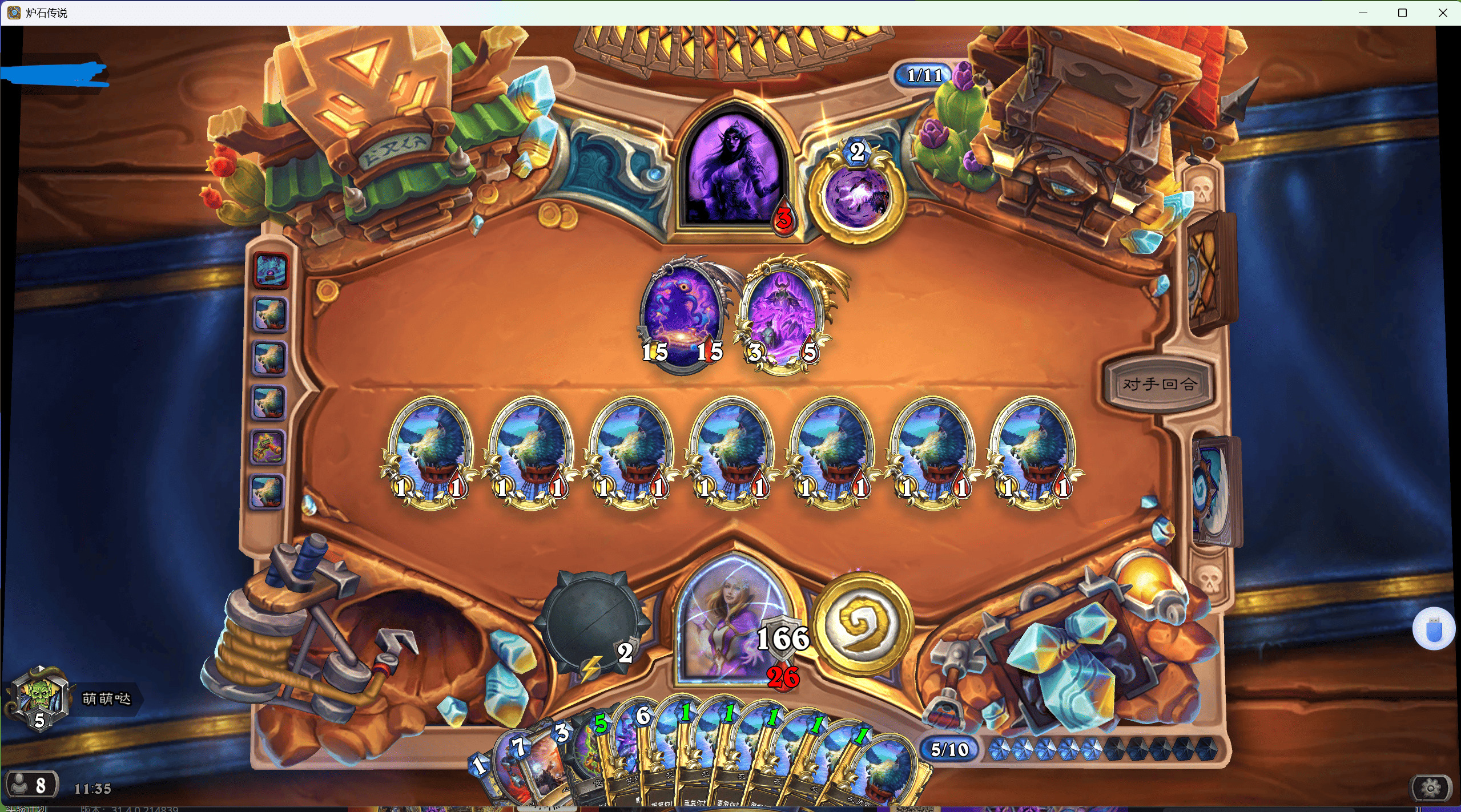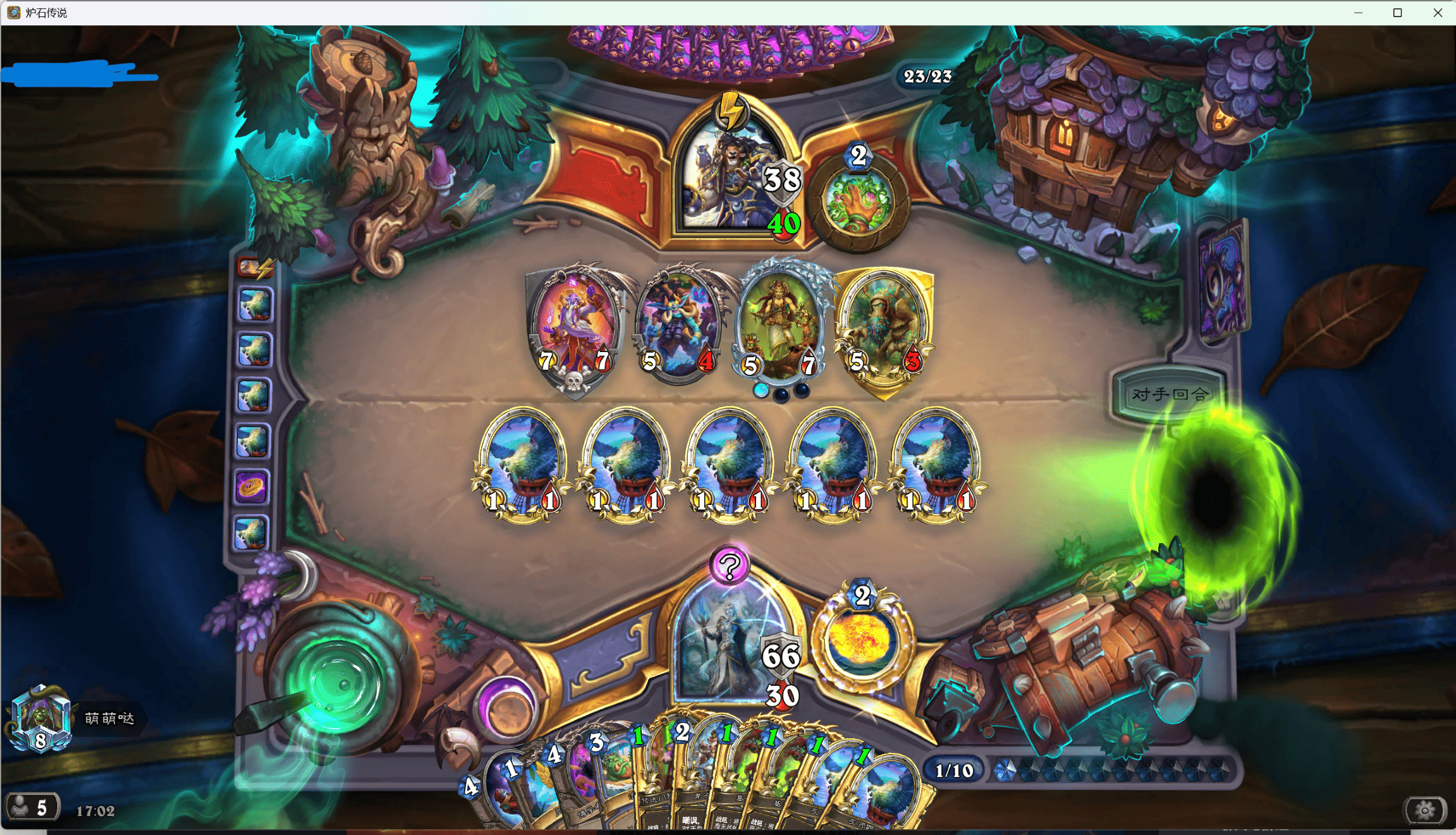 对面爆牌德,手上留俩基尔加丹+鹦鹉防一手国王+铜须脏鼠,接下来打算接着腾手牌增加鹦鹉和基尔加丹数量,结果对面跑了