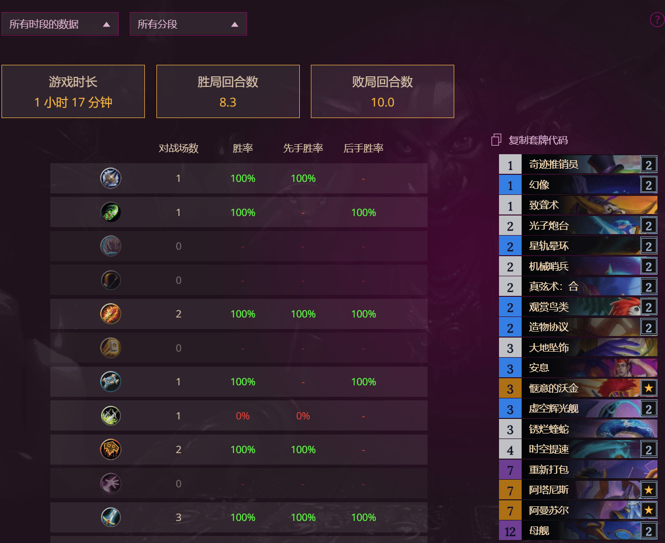 这套星灵牧今天测试了一天接近20把,舍弃群解,换成了我觉得牧师最变态的星轨光环。这张卡非常灵活,既可以配合冲锋和1费复制打otk又可以直接配合蛇油或者22战场。总的来说只输了3把,直接从25万赢回了15万。有7把在车上玩的没开火石输了两把,总体来说18把输3(刀贼,天胡大哥德,奥丁战)记录的战绩如下(星灵打错成星舰):