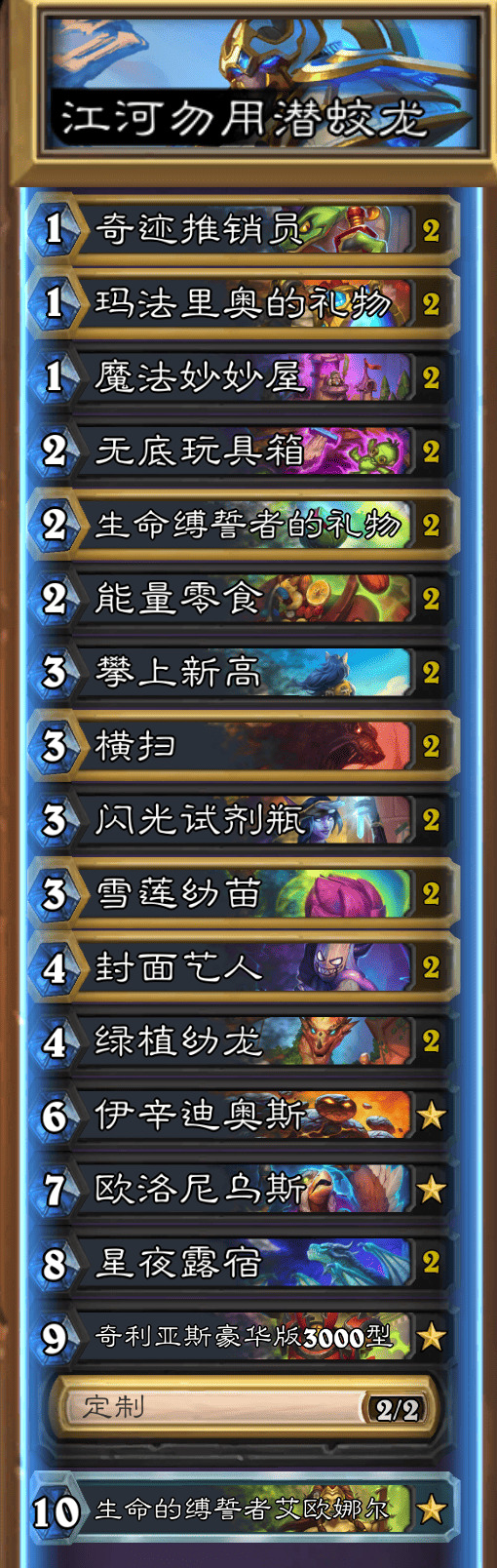 (②)中期。玩具箱、绿植幼龙大部分时间都是直接用来过牌,不贪。这套牌伤害严重溢出,最终斩杀大概只需要2-4张即可,横扫也可以随便交。