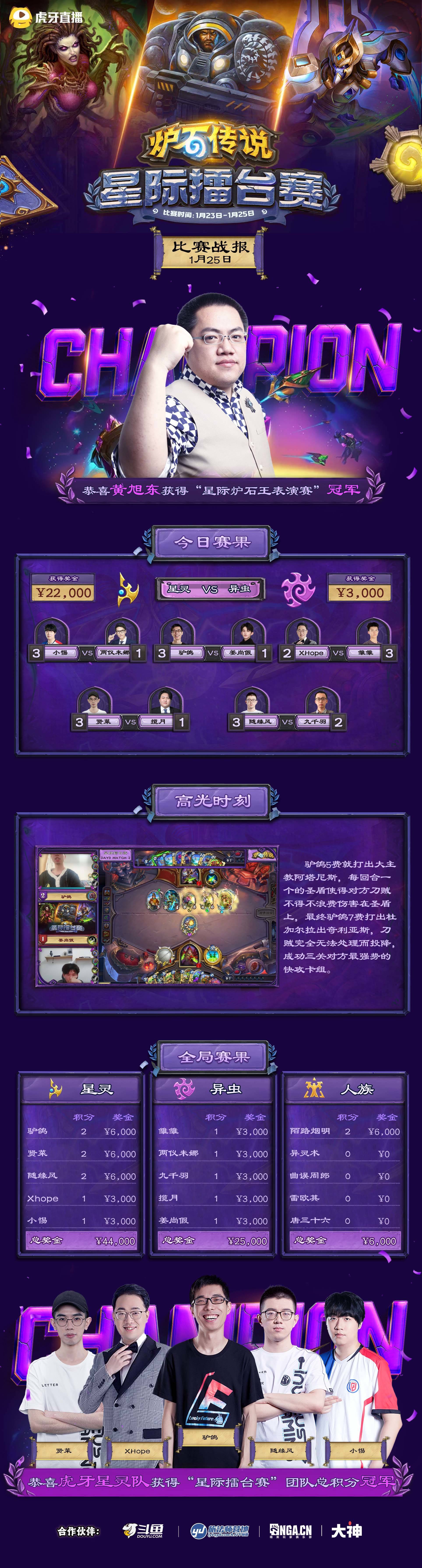 恭喜代表“星灵”阵营的虎牙战队(驴鸽,Xhope,贤菜,随缘风,小惕)夺得本次“星际擂台赛”的冠军!感谢来自虎牙、斗鱼、抖音平台的选手们使用“星际英雄传”迷你系列卡牌带来的精彩对局~