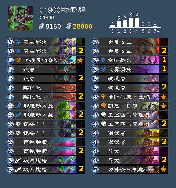 作为一套迷你包版本15+15卡组,我选择用了星舰+墨鸦去契合这个体系。因为瞎子的虫都鼓励多频率攻击转化为直伤,223邪能动力源算是一张勉强合格的buff卡,在对战部分职业的时候有奇效;墨鸦这张卡能配合虫群的突袭给全体buff到高攻,偷鸡、返场都很有用,算是核心之一。