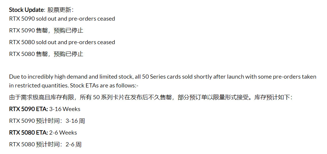 根据Overclockers UK的说法,RTX 5090显卡的缺货情况尤其严重,消费者可能需要等待3-16周才能拿到货,而RTX 5080的供应情况稍好,预计2-6周内能有库存。