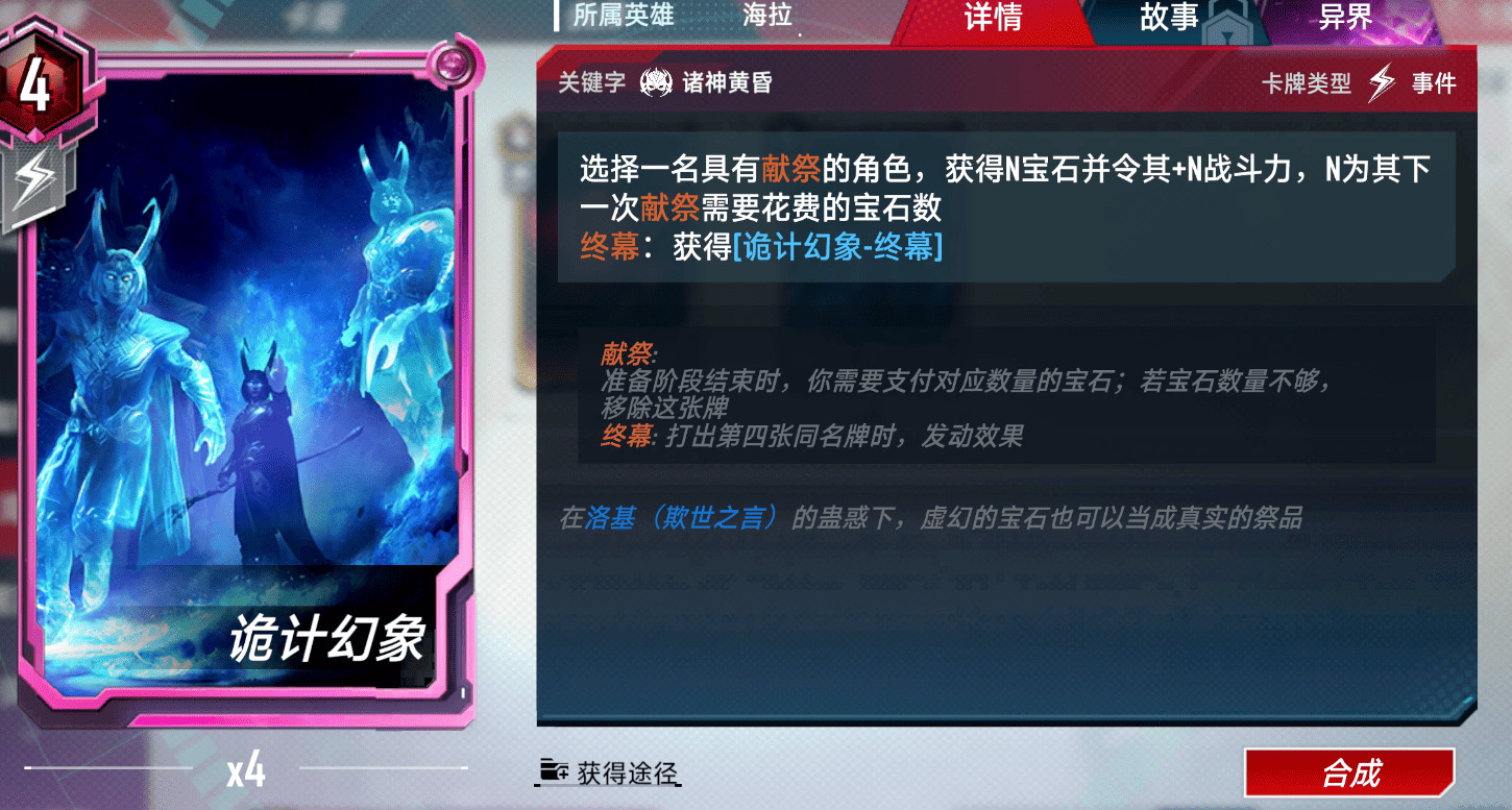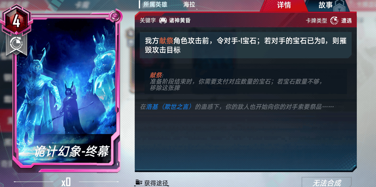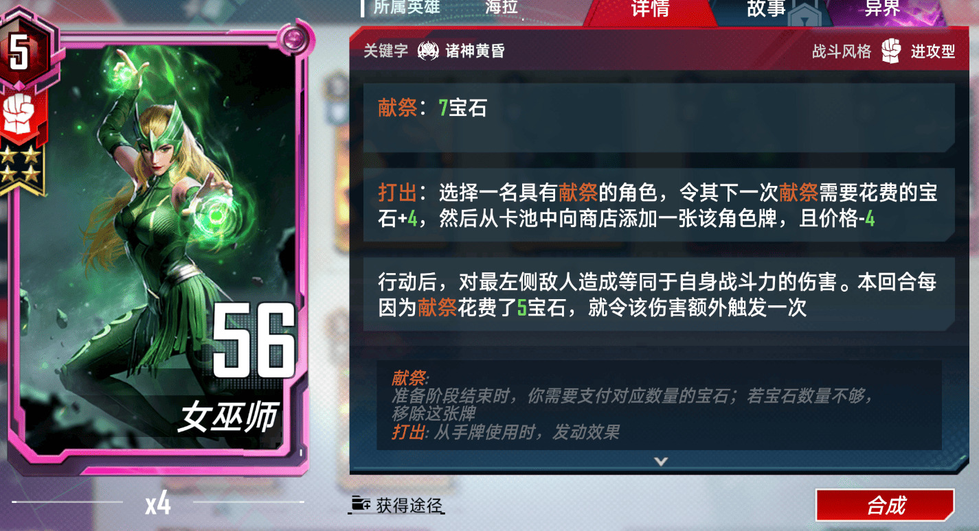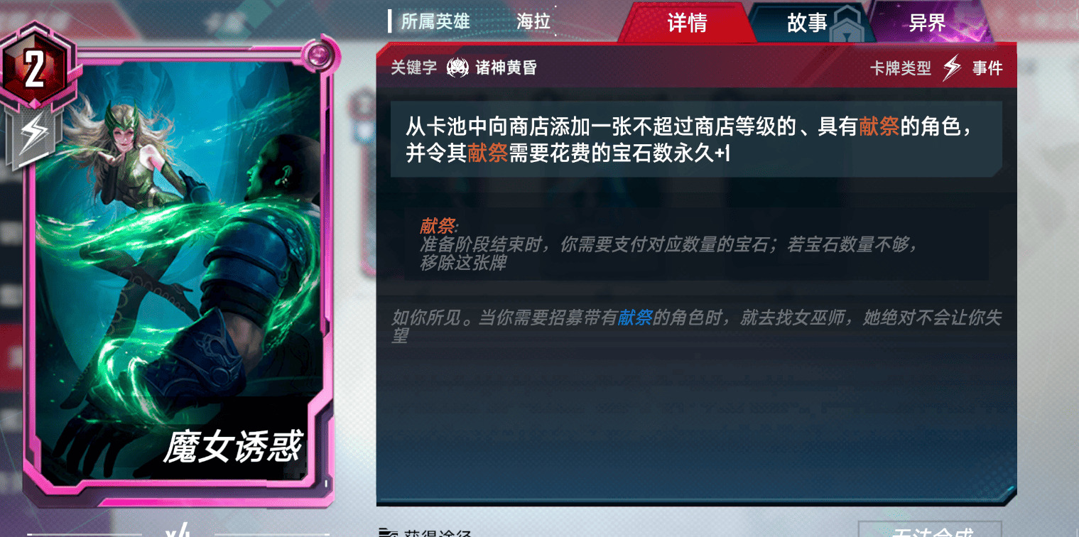 另外,还有一个朴实无华的小妙招,留一个在牌库里可以用魔女诱惑一次给献祭总量+2,用于凑洛基的最终加成(60宝石)。(注:这小技巧本来想藏着的,笑)