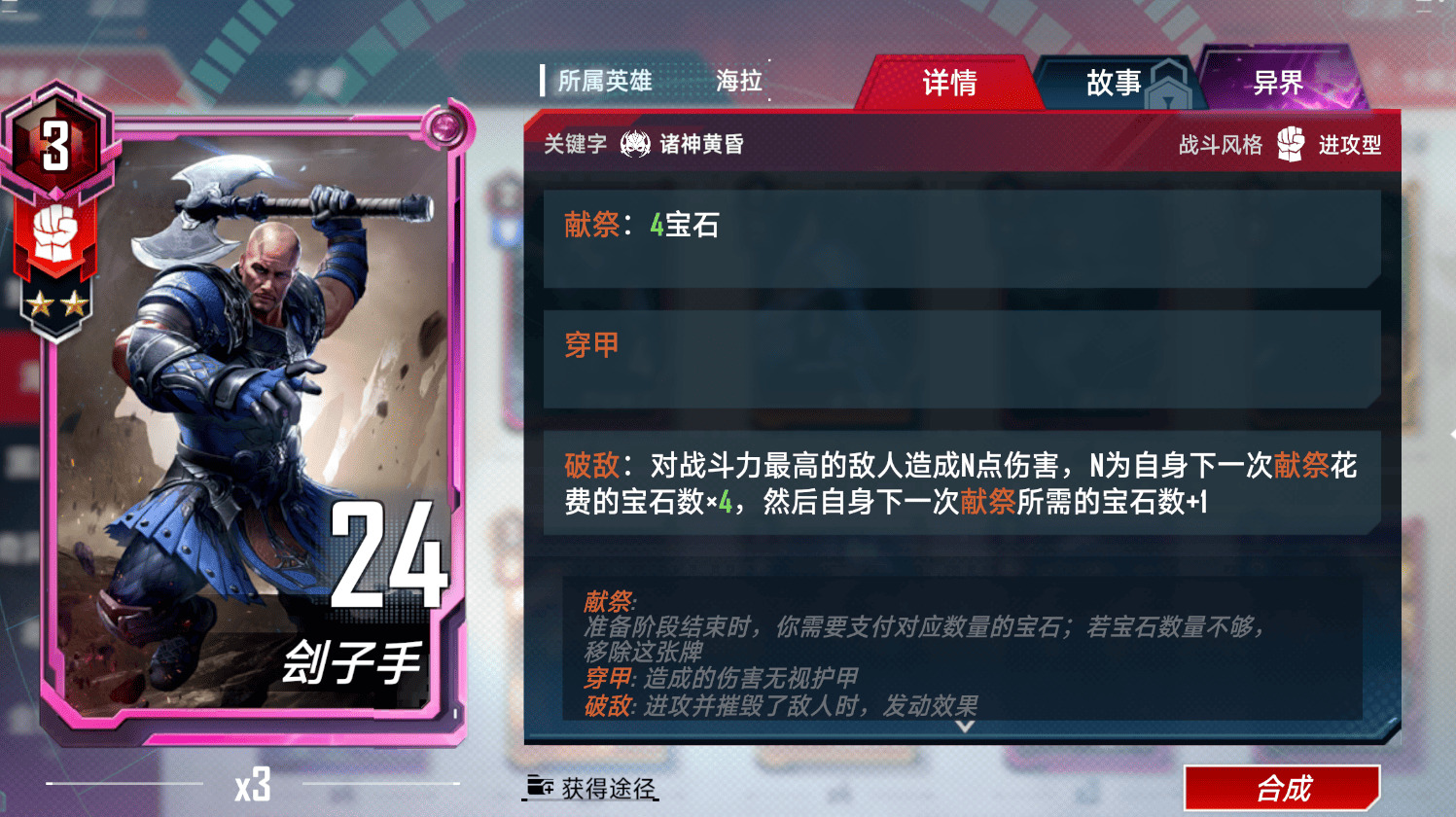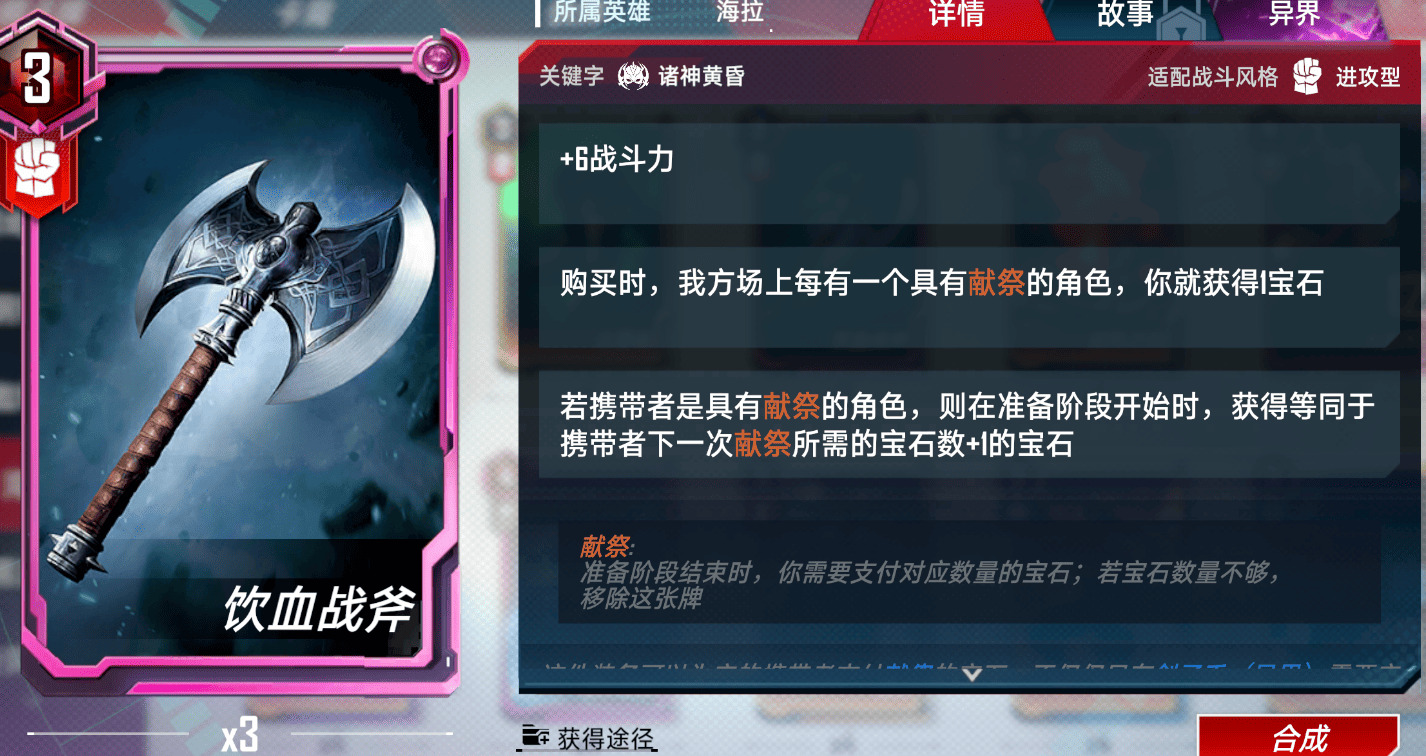 与斧子类似,尽量在场上铺多点献祭再用,提供了大量所需的宝石。没有他也玩不了(至少2张。3张可以2+1后期卖一张。)