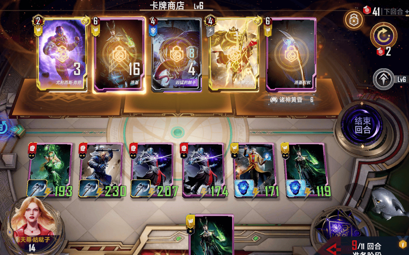 在这一阶段,如果是其他卡组那必然是要合4星的。但由于我现存宝石为41,献祭所需宝石为40,如果买下洛基,现存宝石将变为35,献祭所需宝石会变成41,那么将有至少1个单位会由于无法献祭而被移除导致后续回合卡组强度不够。因此我这里的选择是锁住商店等下回合再购买。