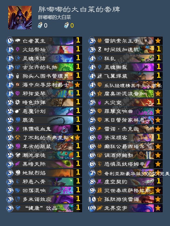 一月传说的时候发过一次了,这次继续发一下,相比于炉石议会清风的原始构筑多塞了张回荡混响来针对大哥萨和圣契骑
