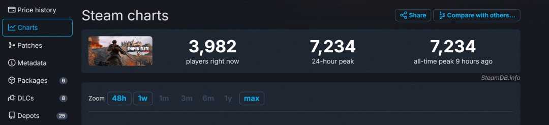 SteamDB显示,《狙击精英:抵抗》Steam同时在线峰值仅7294人,当前在线3982人。《狙击精英:抵抗》首发还登陆了XGP,这可能是该作Steam版评价和在线人数都比较少的重要原因之一。
