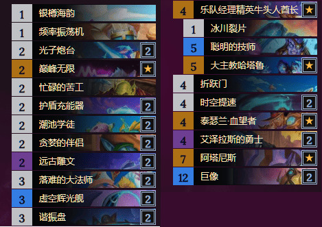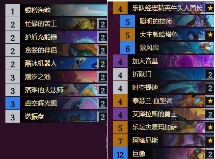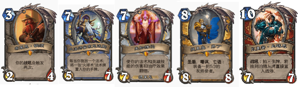 乐队经理精英牛头人酋长:可以放入一些针对环境的应对卡,当艾泽拉斯的勇士开出先知维纶时,配合聪明的技师能回复相当可观的费用,提供斩杀上限;大主教哈塔鲁配合泰瑟兰·血望者能做到一波相当强势的爆发,铜须取出两张也是有一个小组合技。
