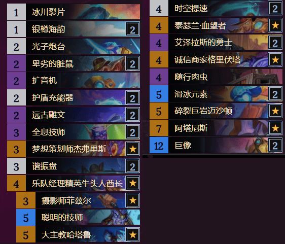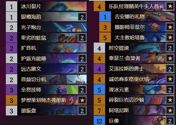 碎裂巨岩迈沙顿:可替换卡位。拉出滑冰元素效果惊人,缺点是第一亏节奏;第二一旦两个滑冰元素上手原地爆炸。好消息是这套前期节奏是不错的,5费亏一点不要紧。
