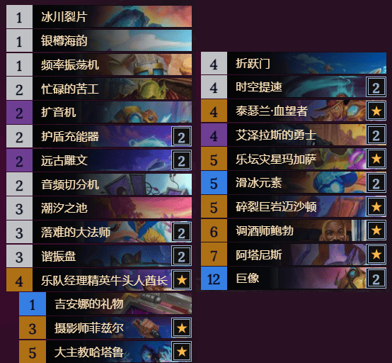 带一张音频切分机以避免部分对局两张艾泽拉斯的勇士开不出铜须/大法师。不带聪明的技师是因为目前我的环境,后期对局手上有维伦、大法师和血望者,伤害基本是够的;带一个更灵活的吉安娜的礼物,偶尔也可以防一下刀贼口德。当然换一张冰川裂片也是可以的。