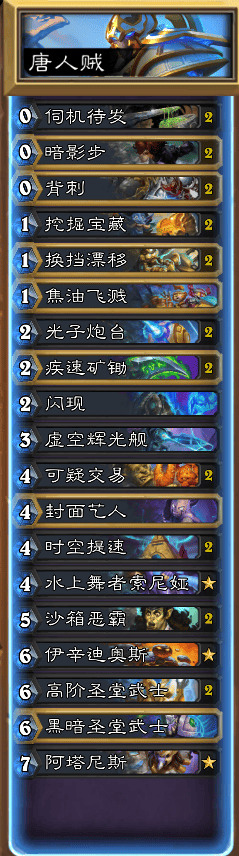 如题,LZ玩战士和萨满玩腻了,想整点活,就尝试玩了圣堂贼,yysy确实好玩,钻五到传说分段尝试了多种构筑,最后版本以80左右胜率打上传说,先上卡组: