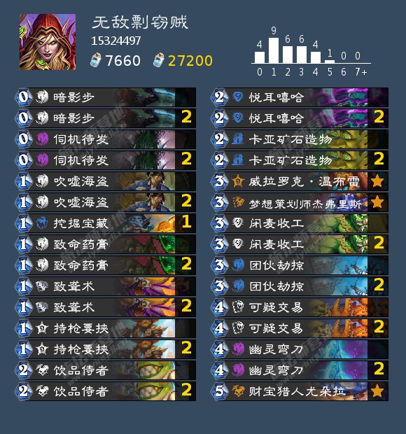 过牌快,低费随从多,节奏好,有刀的情况对战士、萨满、牧师、星灵贼都是优势,目前打萨满只输过两次非常胡的 比较怕口德,脸上的圣盾不好处理
