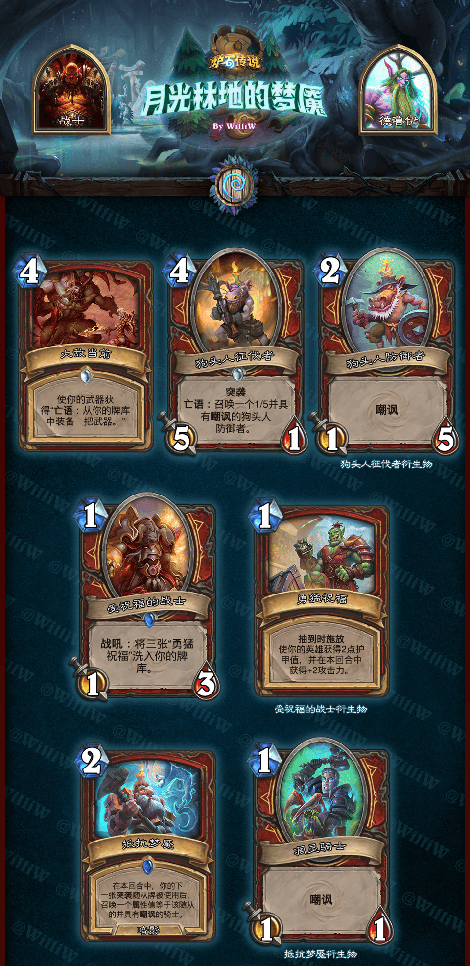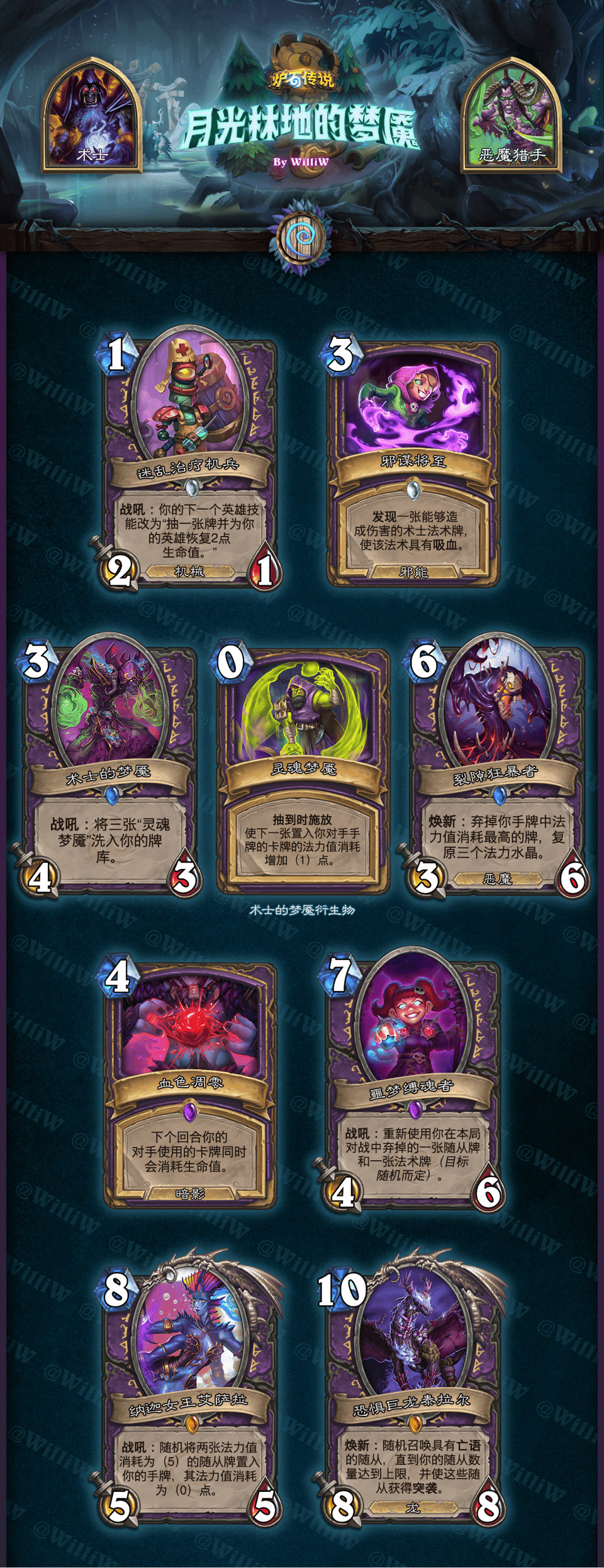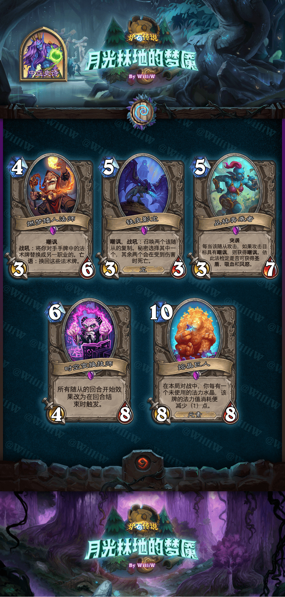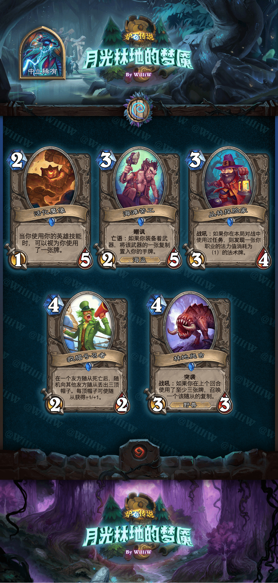 本拓展包由WilliW个人制作完成。大致框架灵感产生于2020年8月,卡牌设计完成于2021年2月,在3月初完成平衡性调整并最终在《贫瘠之地的锤炼》版本上线前(2021年3月26日)发布(当时还没有“新”职业死亡骑士,也许会在之后补档)。感谢在这过程中PSY提供的平衡性意见,Aya给予的美术建议。同时感谢大家能够点击浏览这篇DIY,部分设计和平衡性可能没有做到足够好,希望大家多多包涵!
