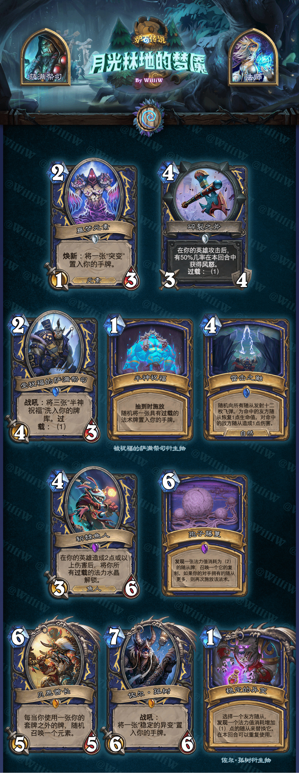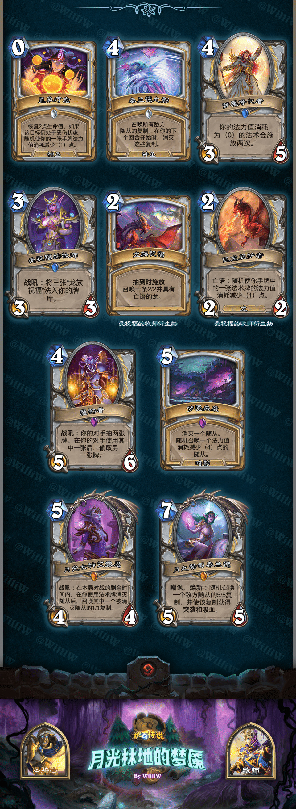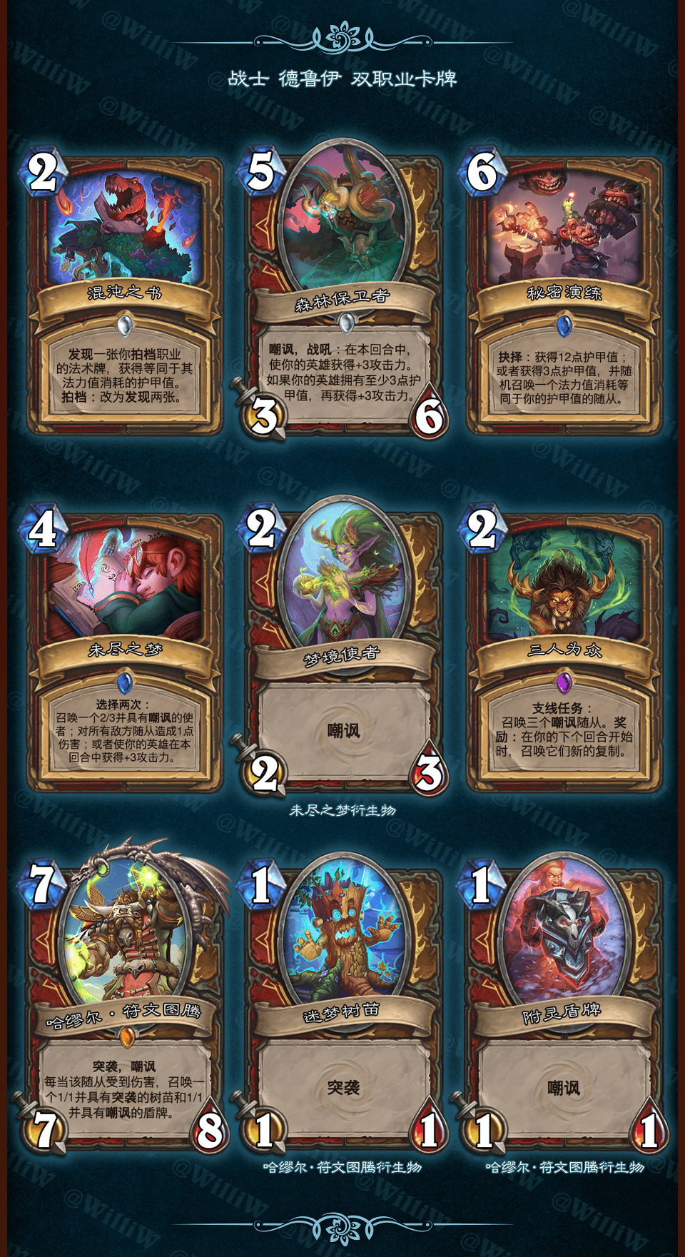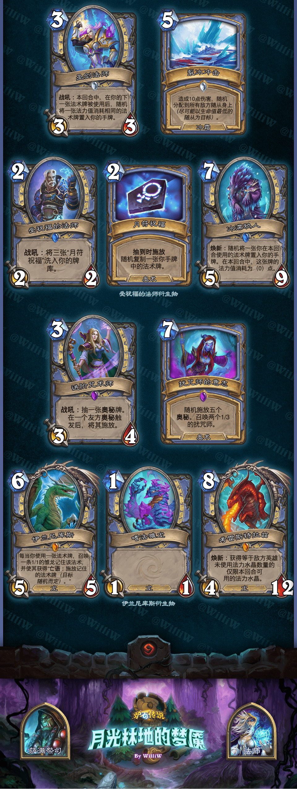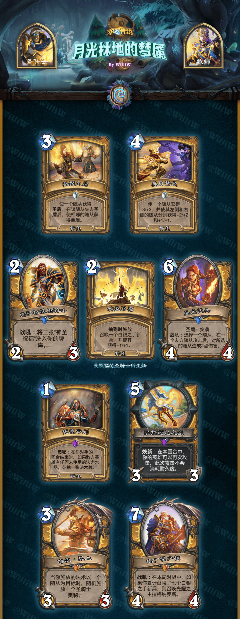 本拓展包由WilliW个人制作完成。大致框架灵感产生于2020年8月,卡牌设计完成于2021年2月,在3月初完成平衡性调整并最终在《贫瘠之地的锤炼》版本上线前(2021年3月26日)发布(当时还没有“新”职业死亡骑士,也许会在之后补档)。感谢在这过程中PSY提供的平衡性意见,Aya给予的美术建议。同时感谢大家能够点击浏览这篇DIY,部分设计和平衡性可能没有做到足够好,希望大家多多包涵!