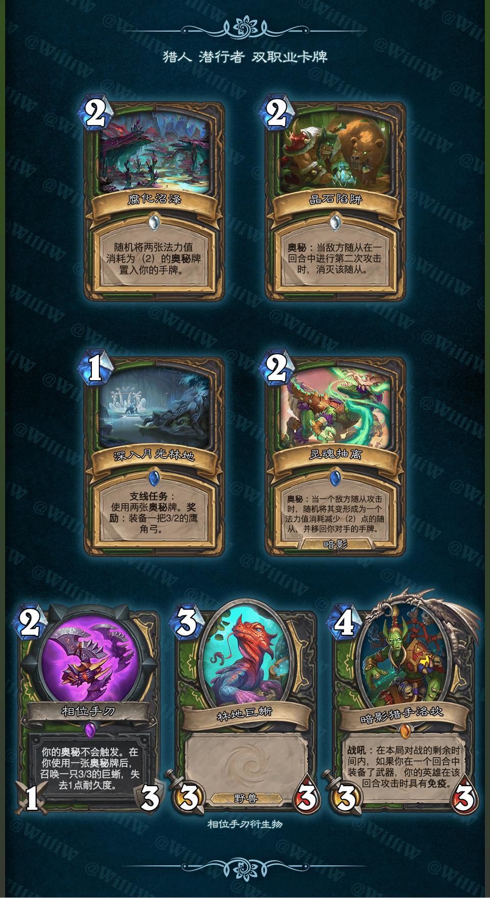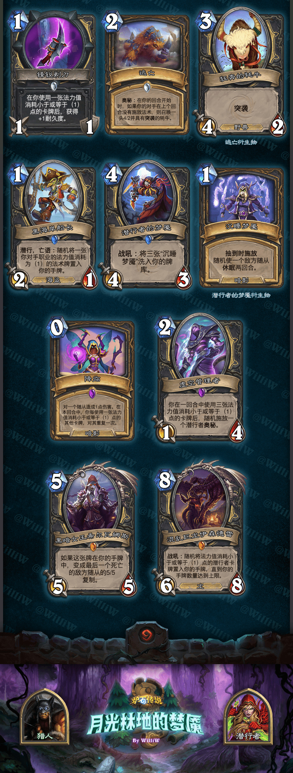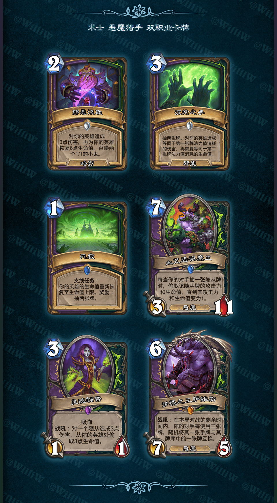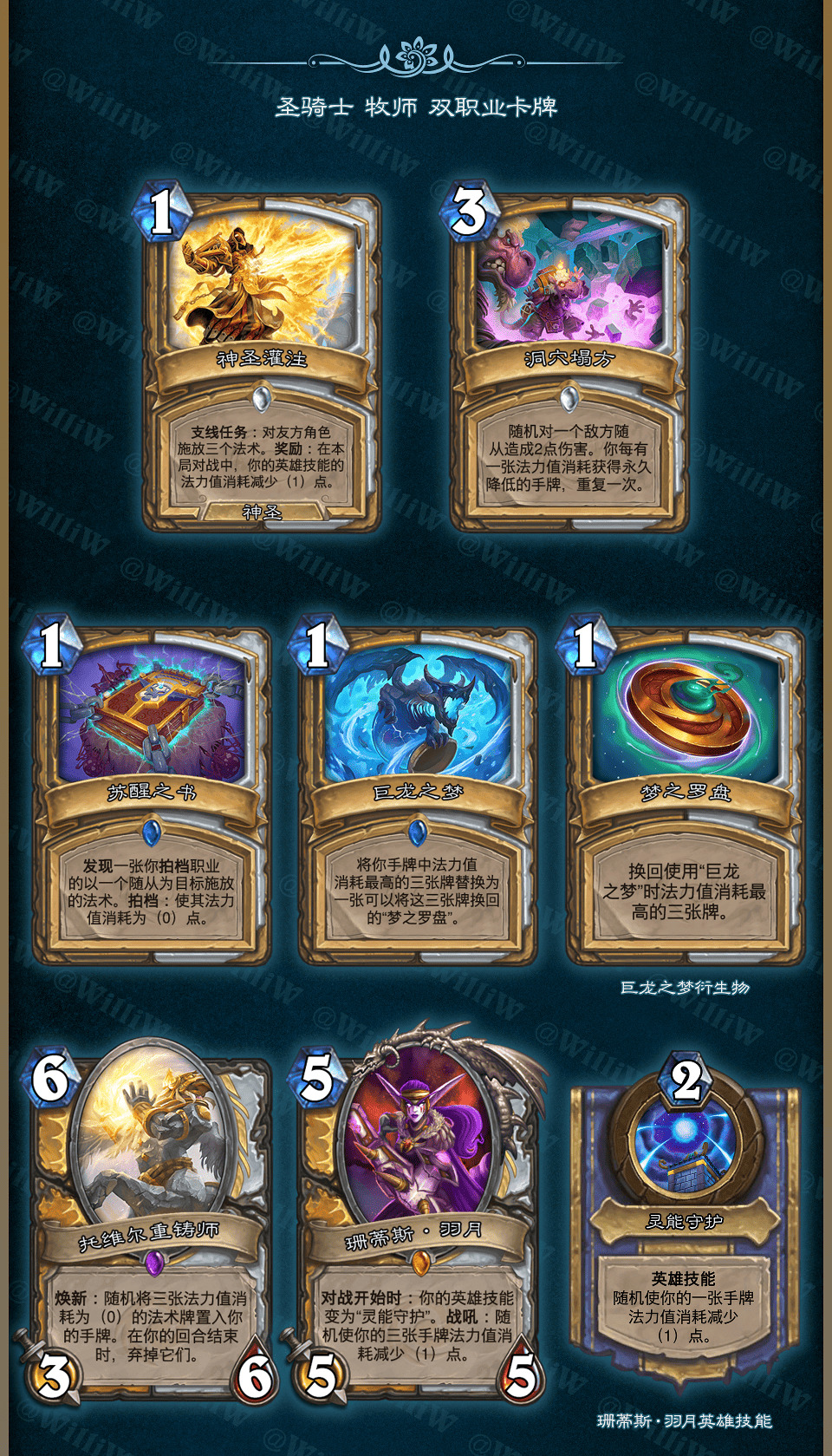 本拓展包由WilliW个人制作完成。大致框架灵感产生于2020年8月,卡牌设计完成于2021年2月,在3月初完成平衡性调整并最终在《贫瘠之地的锤炼》版本上线前(2021年3月26日)发布(当时还没有“新”职业死亡骑士,也许会在之后补档)。感谢在这过程中PSY提供的平衡性意见,Aya给予的美术建议。同时感谢大家能够点击浏览这篇DIY,部分设计和平衡性可能没有做到足够好,希望大家多多包涵!