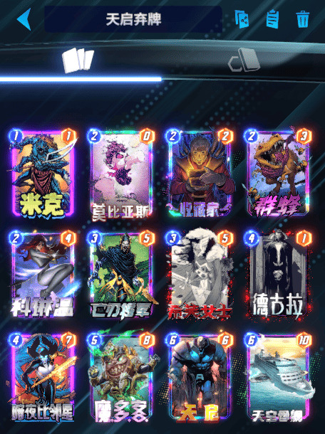 有了米克、亡刃将军、暗夜比邻星之后,弃牌又可以玩了,而且点数比以前要大很多,天空母舰又有足够的信息差,看到弃牌千万不要小瞧,先看看对手带的是什么构筑,然后小心应对,不可小觑。