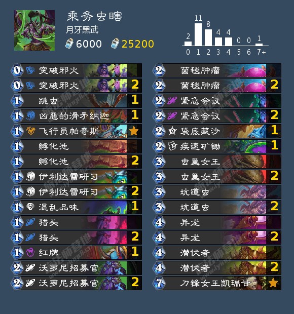 声明一下,本卡组为娱乐卡组,数据仅代表本人使用环境,不适合上分,是一个有着还算稳定展开的快攻卡组,下限高,上限一般,综合整体强度一般,适合卡比较齐的玩家,紫卡和飞行员帕奇斯请谨慎合成,游玩此卡组是来体验下乘务员和瞎子的异虫,喜欢DH的可以试试,下面是我的数据: