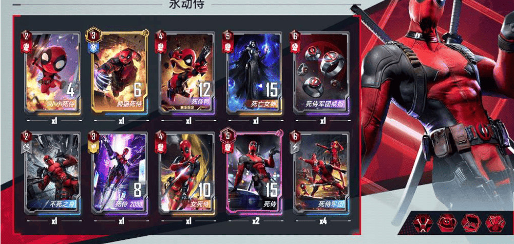 异界死侍核心,一张即可,后面超过20身材我会卖掉,所以带了两张,死侍兵团后期可以赌一波五费的普通死侍,直接10血砍头。