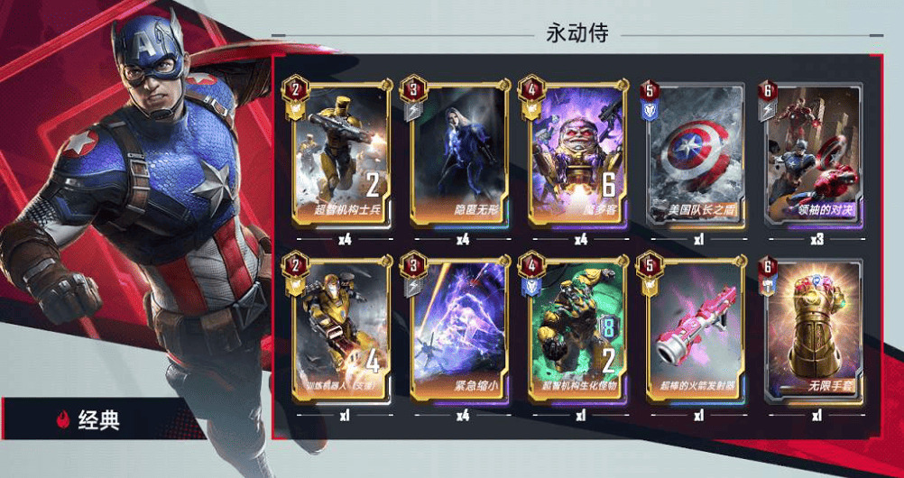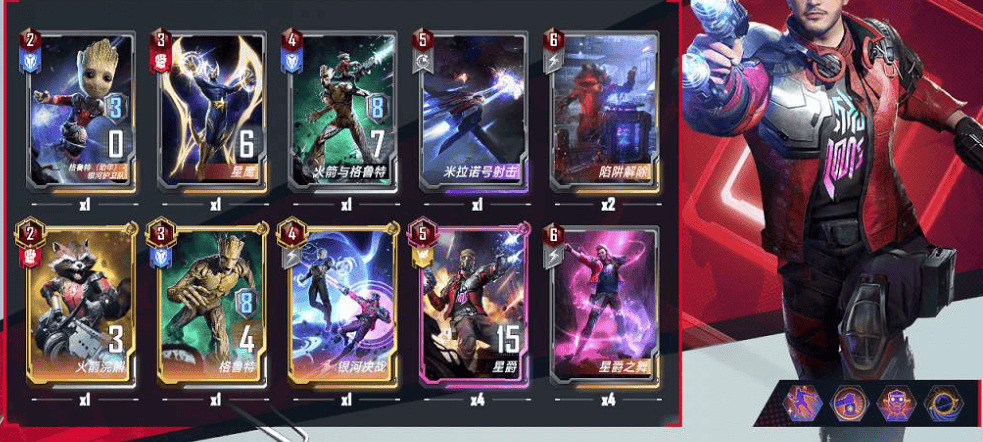 小浣熊链接,前期锁血。异界星爵一张即可,不需要四张,加身材用的。六费对策卡,星爵这个英雄可以随意,(万磁王有防晕头盔、金刚狼有小死侍链接、惊奇女士有护盾)自己喜欢带啥就带啥,反正六个位置有一个空位,那个位置放谁,如果大家有更好的选择,欢迎踊跃讨论。
