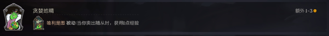 贪婪地精的技能是被动效果,效果是当你卖出随从时,会获得1点经验。开局额外金币为1-3个。