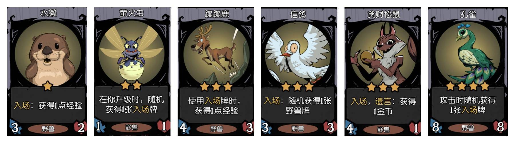 野兽种族的经济牌很多,大多与入场有关。一本的水獭,三本的信鸽和贪财松鼠都可以为贪婪地精提供额外资源,购买这些牌的收益搭配贪婪地精的技能可以提供超过3金币的收益。二本的萤火虫和三本的蹦蹦鹿一个可以在速本的过程中一直提供资源,一个加速速本过程,都是贪婪地精可以抓取的牌。孔雀在中期重点发育身材,可以一直提供入场牌。