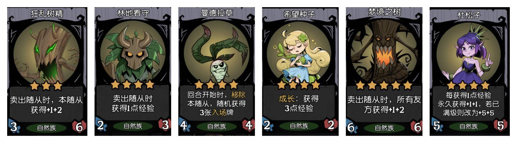 这版本自然种族中的经济牌并不算多,但与买卖和经验挂钩的随从则很多,因此自然种族是较为契合贪婪地精的种族。首先是老牌买卖核心狂乱树精和林地看守,一个可以搭配贪婪地精提供中后期战力,一个则可以加速升本速度。曼德拉草可以提供三张牌,是自然种族极为重要的资源牌,而希望种子一回合就可以提供至少三点经验和1个金币,也是非常不错的选择。当你的牌很多时,也可以选择梦境之树提升阵容战力。最后是杜松子,杜松子的效果决定了它可以因为贪婪地精的效果而卖牌时升级身材,在升到六本后所加身材速度更会翻五倍,因此杜松子是贪婪地精在中后期极佳的战力选择。