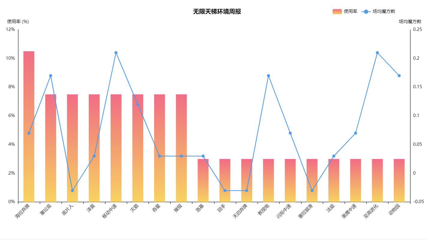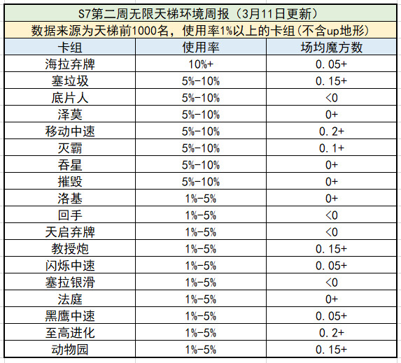 从数据来看,官方现在给的都是天梯前1000对局,全是高手对决,很难吃到大分,所以魔方数肯定会偏低,在这个数据统计下,能达到0.15~0.2的卡组都是很优秀的了,超过0.1的都是可以玩的,剩下的卡组需要拼操作和理解了。